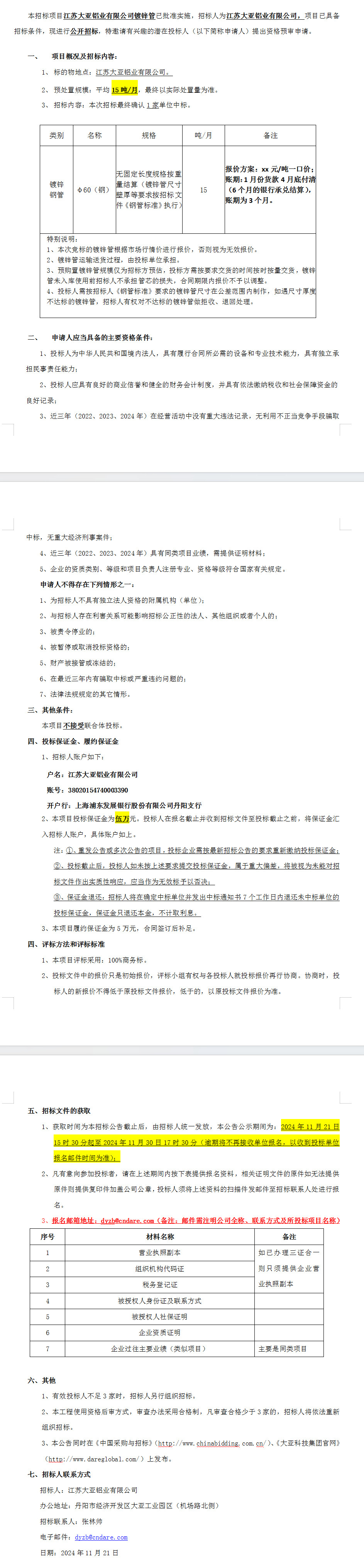 江蘇大亞鋁業(yè)有限公司 鍍鋅管招標(biāo)公告