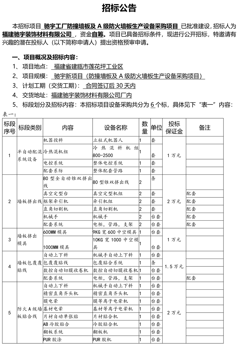 馳宇工廠防撞墻板及A級防火墻板生產(chǎn)設(shè)備采購項(xiàng)目招標(biāo)公告