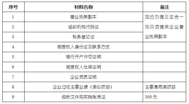 2、 凡有意向參加投標者,請在上述期間內按下表提供報名資料,相關證明文件的原件如無法提供原件則提供復印件加蓋公司公章,投標人須將上述資料的掃描件發(fā)郵件至招標聯(lián)系人處進行報名。