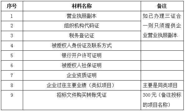 2、 凡有意向參加投標者,請在上述期間內按下表提供報名資料,相關證明文件的原件如無法提供原件則提供復印件加蓋公司公章,投標人須將上述資料的掃描件發(fā)郵件至招標聯系人處進行報名。
