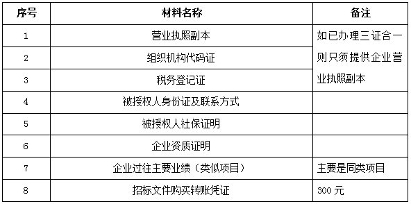 2、 凡有意向參加投標(biāo)者,請在上述期間內(nèi)按下表提供報名資料,相關(guān)證明文件的原件如無法提供原件則提供復(fù)印件加蓋公司公章,投標(biāo)人須將上述資料的掃描件發(fā)郵件至招標(biāo)聯(lián)系人處進(jìn)行報名。