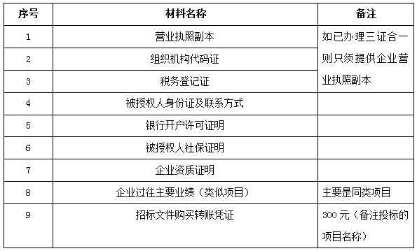 2、 凡有意向參加投標(biāo)者,請(qǐng)?jiān)谏鲜銎陂g內(nèi)按下表提供報(bào)名資料,相關(guān)證明文件的原件如無法提供原件則提供復(fù)印件加蓋公司公章,投標(biāo)人須將上述資料的掃描件發(fā)郵件至招標(biāo)聯(lián)系人處進(jìn)行報(bào)名。