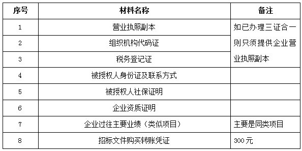 2、 凡有意向參加投標(biāo)者,請(qǐng)?jiān)谏鲜銎陂g內(nèi)按下表提供報(bào)名資料,相關(guān)證明文件的原件如無(wú)法提供原件則提供復(fù)印件加蓋公司公章,投標(biāo)人須將上述資料的掃描件發(fā)郵件至招標(biāo)聯(lián)系人處進(jìn)行報(bào)名。