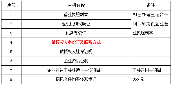 2、 凡有意向參加投標(biāo)者,請(qǐng)?jiān)谏鲜銎陂g內(nèi)按下表提供報(bào)名資料,相關(guān)證明文件的原件如無(wú)法提供原件則提供復(fù)印件加蓋公司公章,投標(biāo)人須將上述資料的掃描件發(fā)郵件至招標(biāo)聯(lián)系人處進(jìn)行報(bào)名。