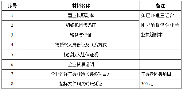 2、 凡有意向參加投標(biāo)者,請?jiān)谏鲜銎陂g內(nèi)按下表提供報(bào)名資料,相關(guān)證明文件的原件如無法提供原件則提供復(fù)印件加蓋公司公章,投標(biāo)人須將上述資料的掃描件發(fā)郵件至招標(biāo)聯(lián)系人處進(jìn)行報(bào)名。