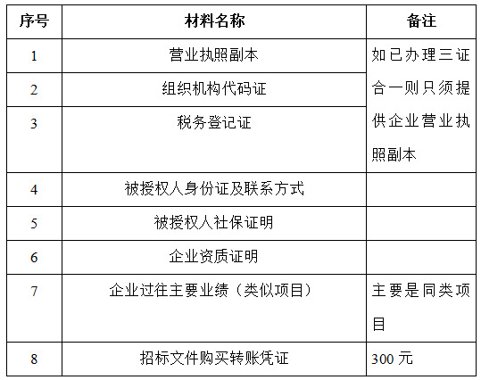 2、 凡有意向參加投標(biāo)者,請?jiān)谏鲜銎陂g內(nèi)按下表提供報(bào)名資料,相關(guān)證明文件的原件如無法提供原件則提供復(fù)印件加蓋公司公章,投標(biāo)人須將上述資料的掃描件發(fā)郵件至招標(biāo)聯(lián)系人處進(jìn)行報(bào)名。