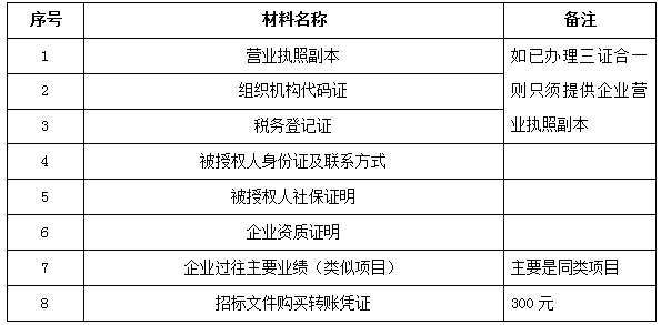 2、 凡有意向參加投標(biāo)者,請(qǐng)?jiān)谏鲜銎陂g內(nèi)按下表提供報(bào)名資料,相關(guān)證明文件的原件如無(wú)法提供原件則提供復(fù)印件加蓋公司公章,投標(biāo)人須將上述資料的掃描件發(fā)郵件至招標(biāo)聯(lián)系人處進(jìn)行報(bào)名。