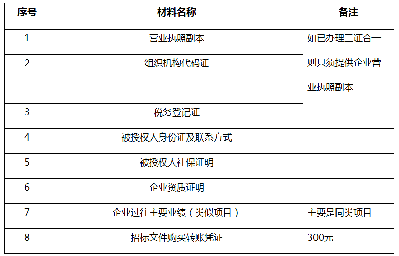 凡有意向參加投標者,請在上述期間內(nèi)按下表提供報名資料,相關(guān)證明文件的原件如無法提供原件則提供復印件加蓋公司公章,投標人須將上述資料的掃描件發(fā)郵件至招標聯(lián)系人處進行報名。