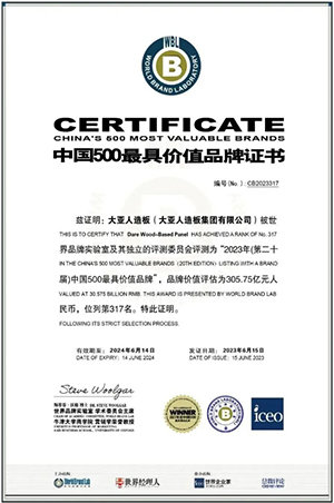 2023年,大亞人造板以305.75億元品牌價(jià)值蟬聯(lián)中國(guó)人造板行業(yè)榜首,價(jià)值增幅33.6%!品牌排名317位,第六次榮登最具價(jià)值品牌(人造板行業(yè))榜首!