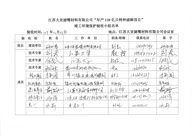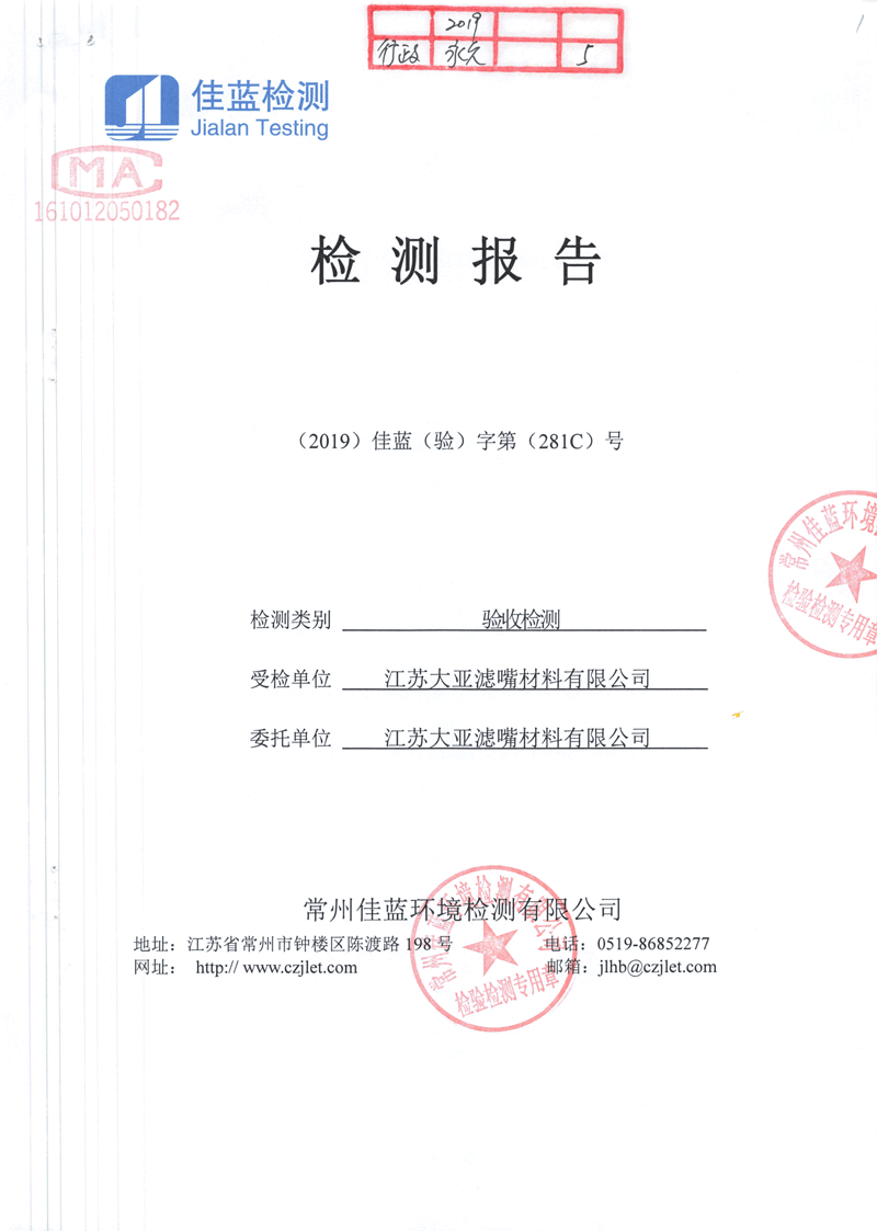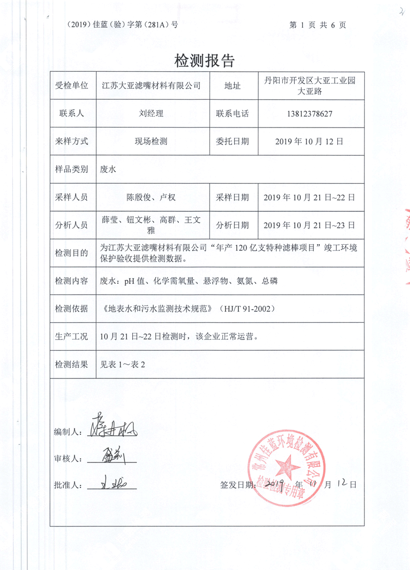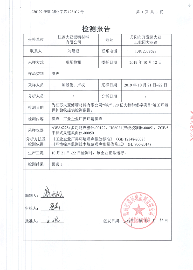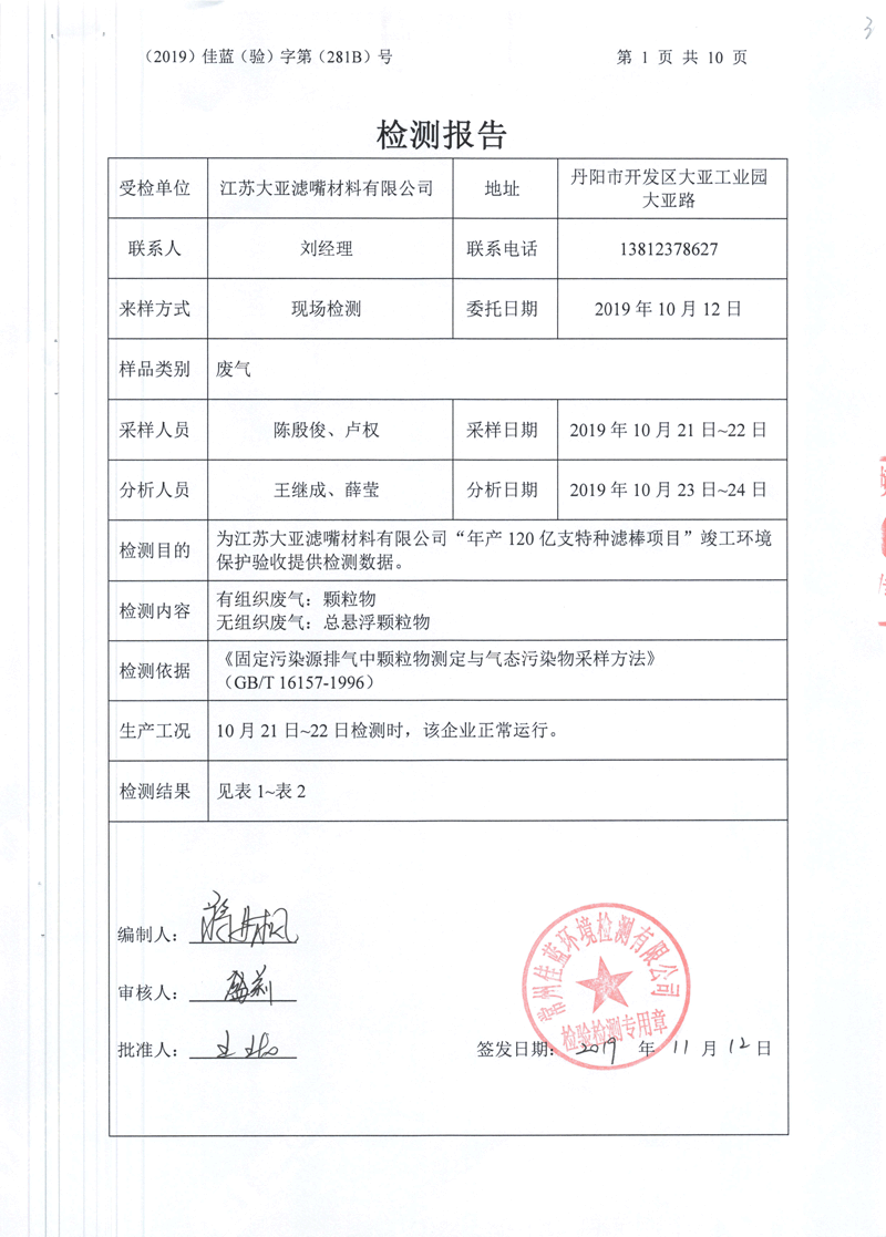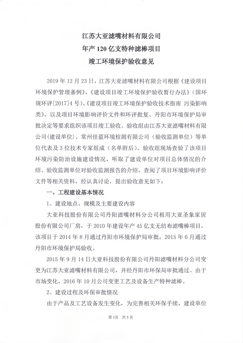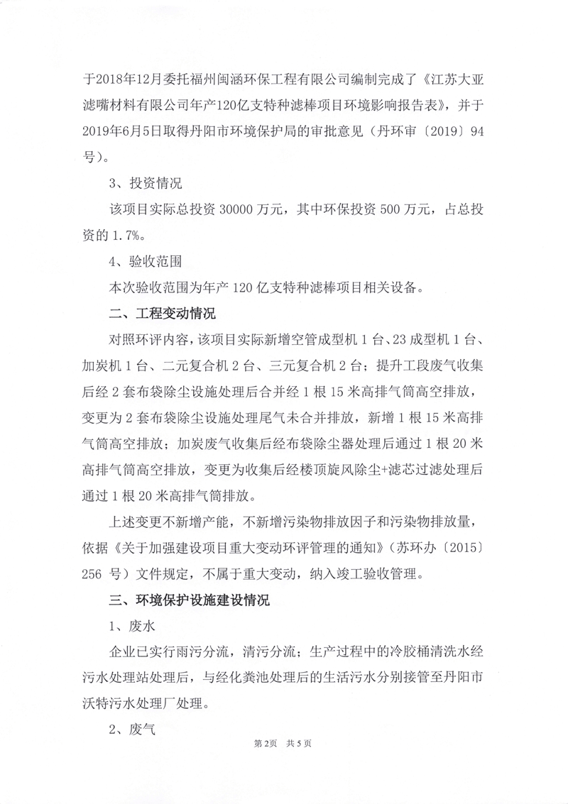 江蘇大亞濾嘴材料有限公司年產(chǎn)120億支特種濾棒項(xiàng)目環(huán)境保護(hù)驗(yàn)收監(jiān)測情況自主公示