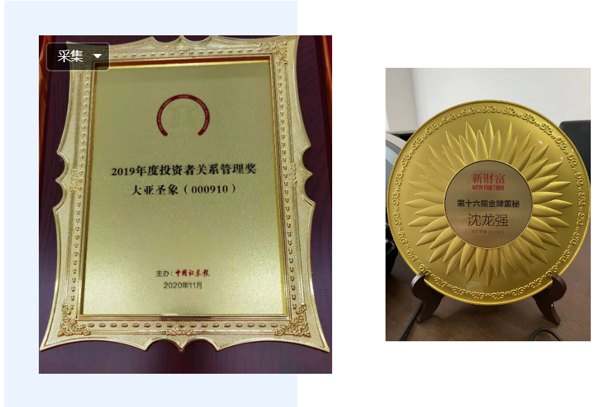 同時,大亞圣象董秘沈龍強于2020年11月20日獲得第十六屆新財富“金牌董秘”殊榮。上市公司和董秘同時獲得資本市場最具權威的兩個獎項,反映出資本市場對上市公司在公司治理、信息披露、優(yōu)秀投資者關系管理等方面的充分肯定,公司將會再接再厲,砥礪前行,用業(yè)績回報廣大投資者。
