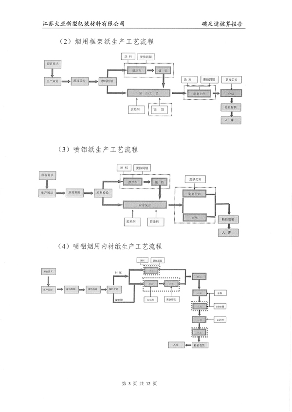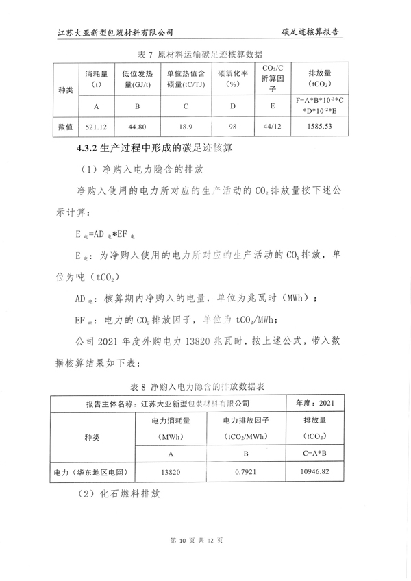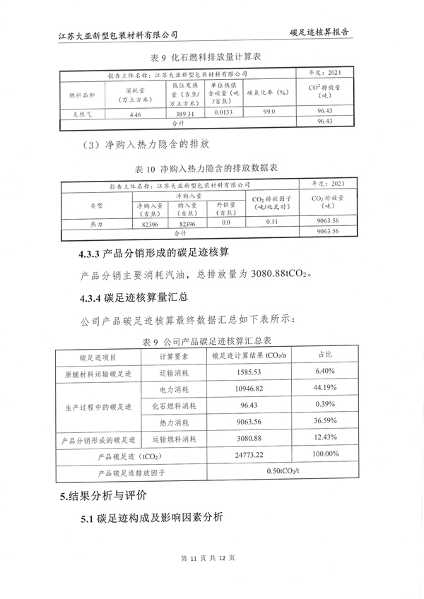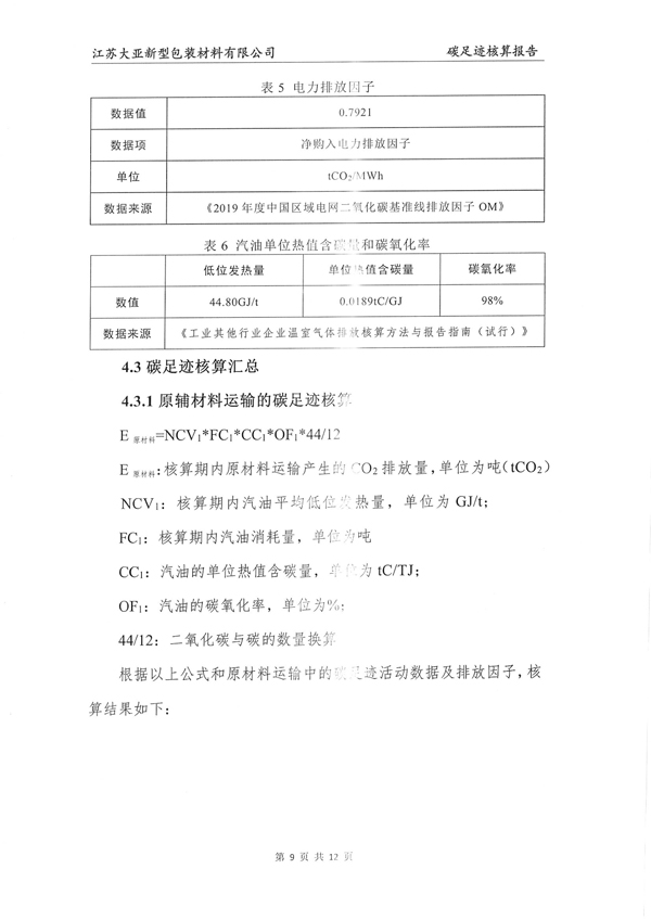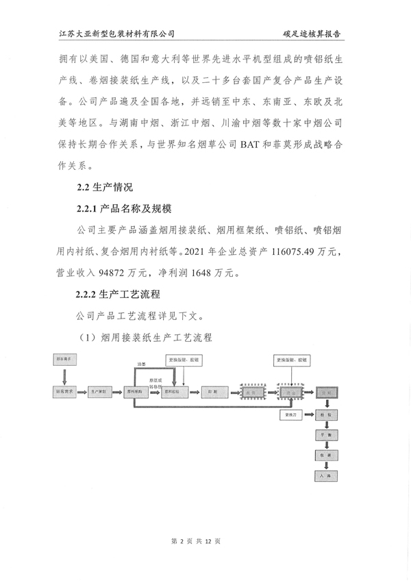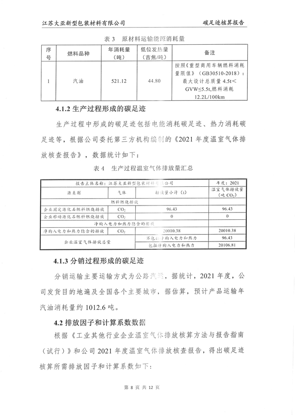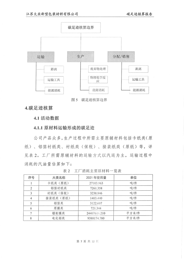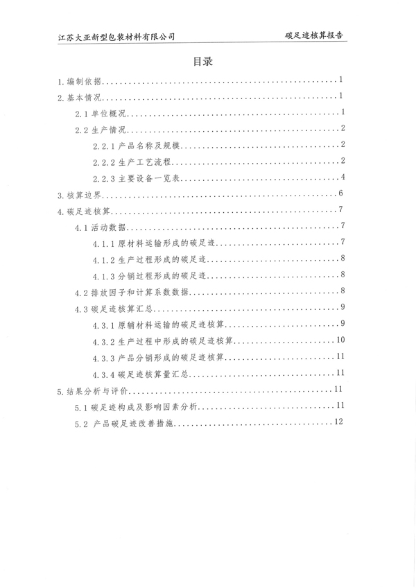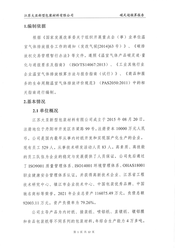 《江蘇大亞新型包裝材料有限公司2021年碳足跡核算報(bào)告》根據(jù)《國(guó)家發(fā)展改革委關(guān)于組織開(kāi)展重點(diǎn)企(事)業(yè)單位溫室氣體排放報(bào)告工作的通知(發(fā)改氣候[2014]63號(hào))》、《碳排放權(quán)交易管理暫行辦法》等文件,遵照《溫室氣體產(chǎn)品碳足跡·量化與通報(bào)要求及指南》(ISO/TS14067:2013)、《工業(yè)其他行業(yè)企業(yè)溫室氣體排放核算方法與報(bào)告指南(試行)》、《商品和服務(wù)的生命周期溫室氣體排放評(píng)價(jià)規(guī)范》(PAS2050:2011)中的相關(guān)指南進(jìn)行編制。